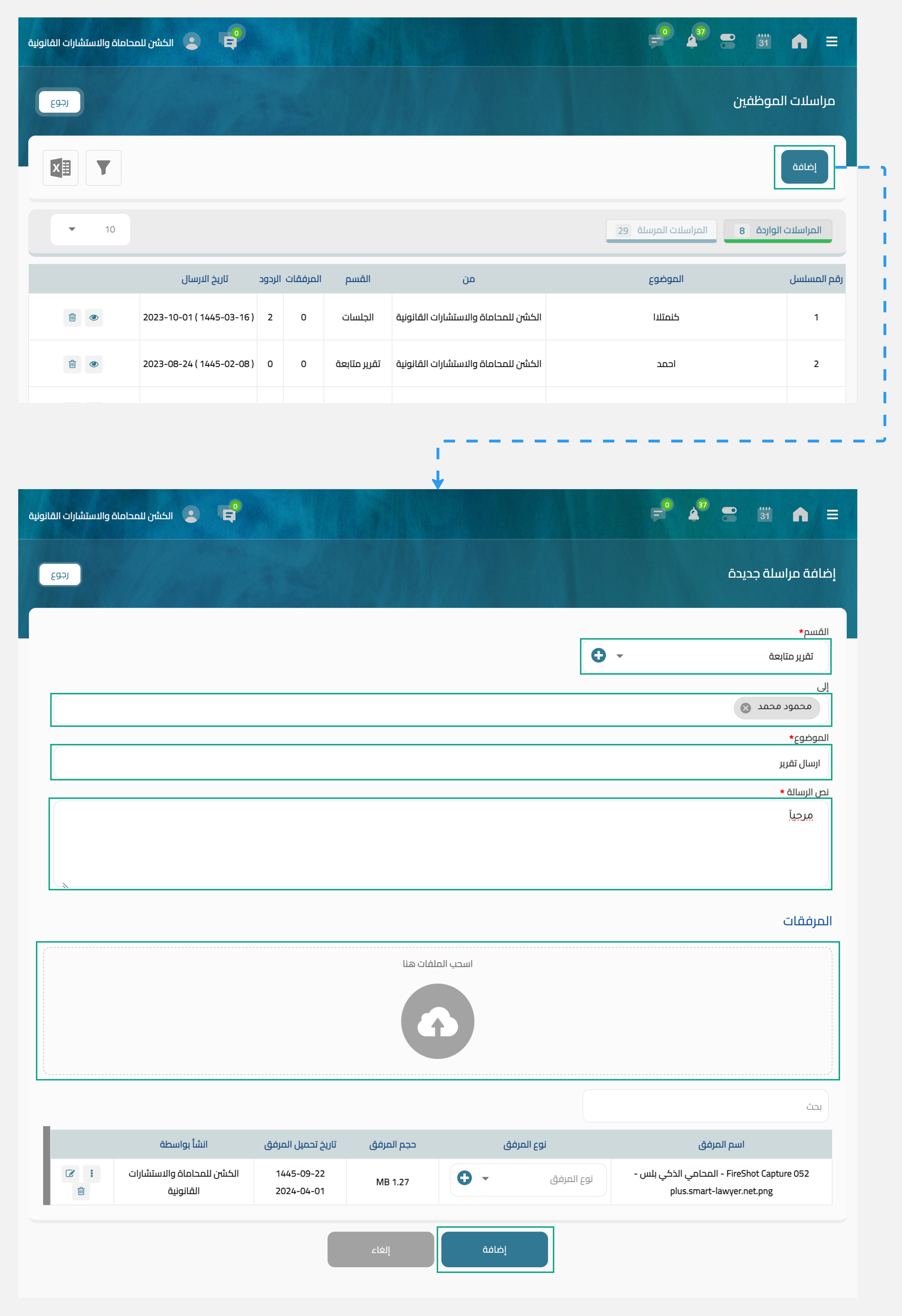 بعد اضافة البيانات يمكنك بعدها الضغط على اضافة ليتم إرسال الرسالة للموظف عن طريق بريده الإلكتروني المُسجل في النظام، كما يمكنك الإطلاع والرد على الرسالة.