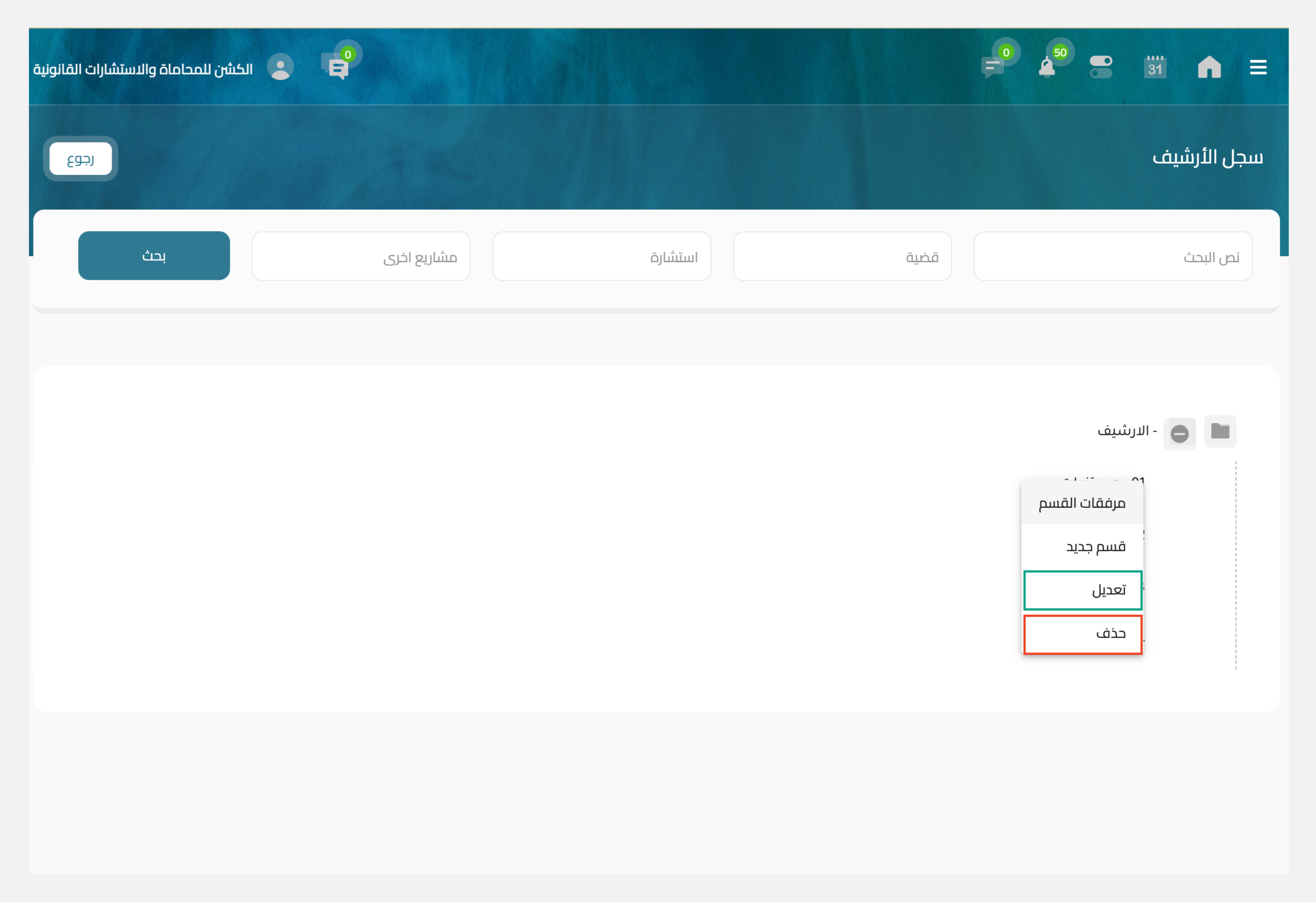 يمكنك القيام ببعض الاجراءات لكل قسم داخل الارشيف عن طريق تحديد القسم المُراد التحكم به ثم الضغط بالزر الأيسر للفارة بحيث يمكنك التعديل لتعديل أسم القسم أو الحذف بحيث يتم حذف القسم.