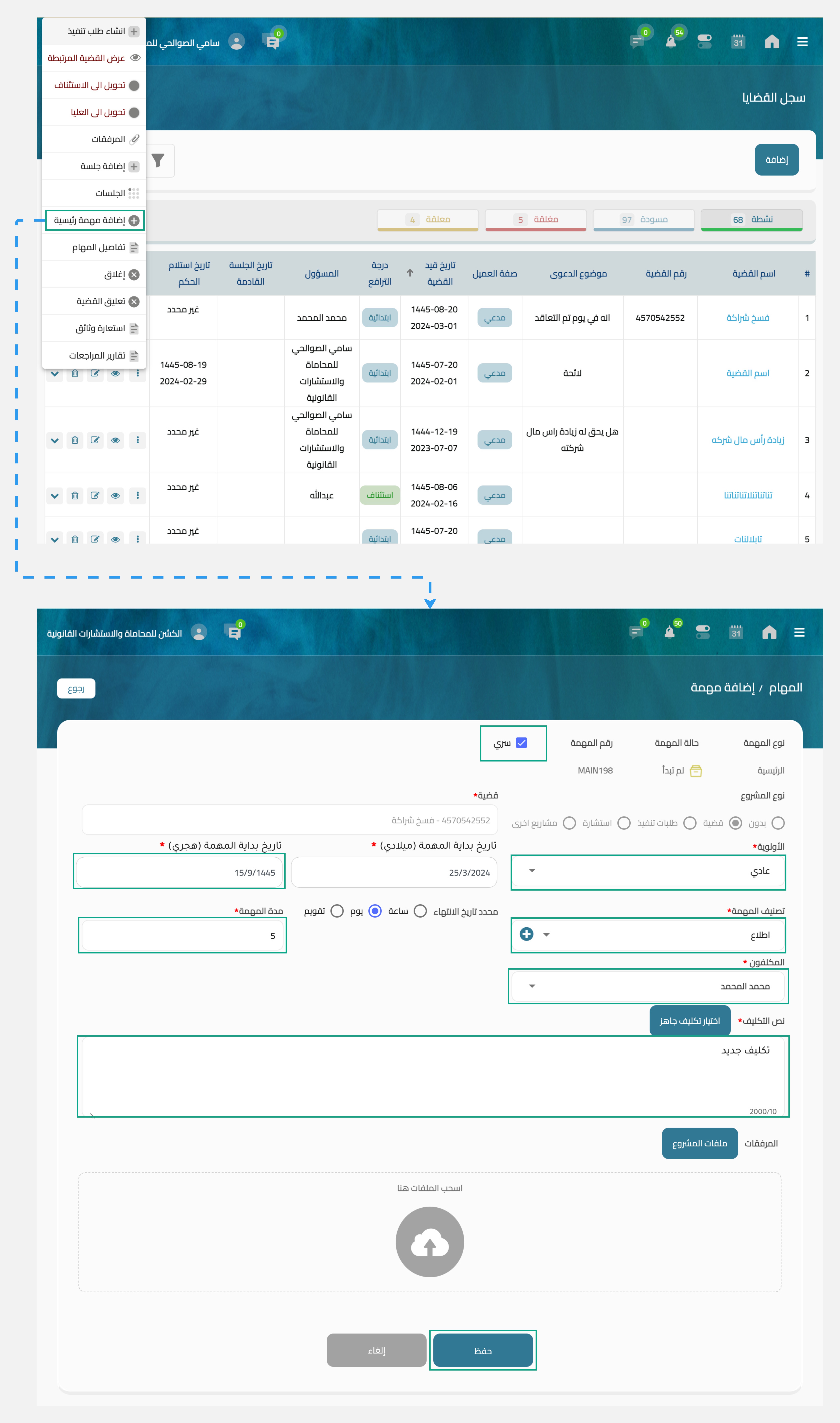 تسمح لك اضافة مهمة رئيسية إمكانية تكليف موظف/ محامي بها كما يمكن لك تكليف المهمة لأكثر من موظف عن طريق تحديد الموظفين المسؤلين عن هذه المهمة.