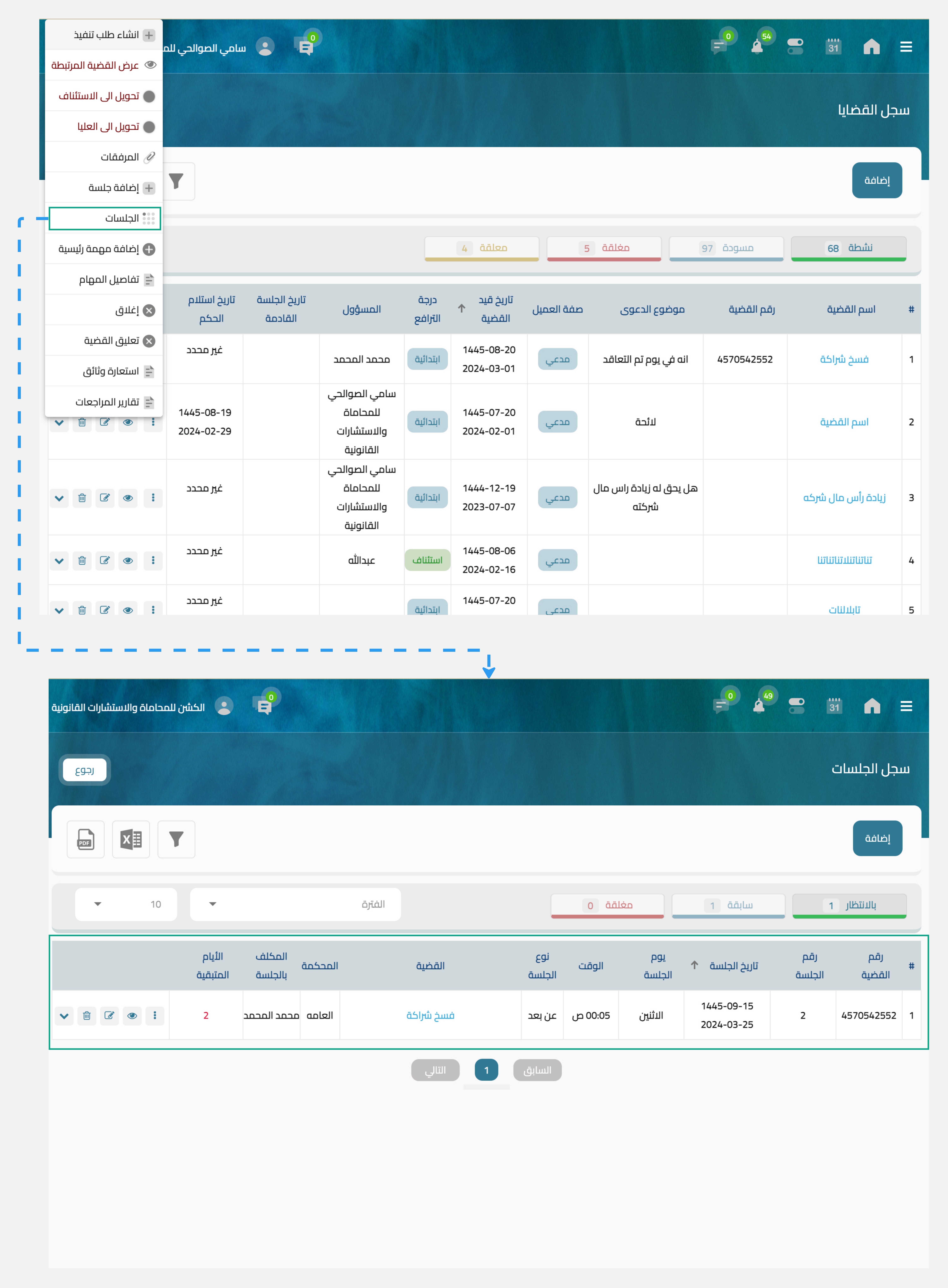 " وإختيار "جلسات القضية". - سيتم عرض جميع الجلسات الخاصة بالقضية.
