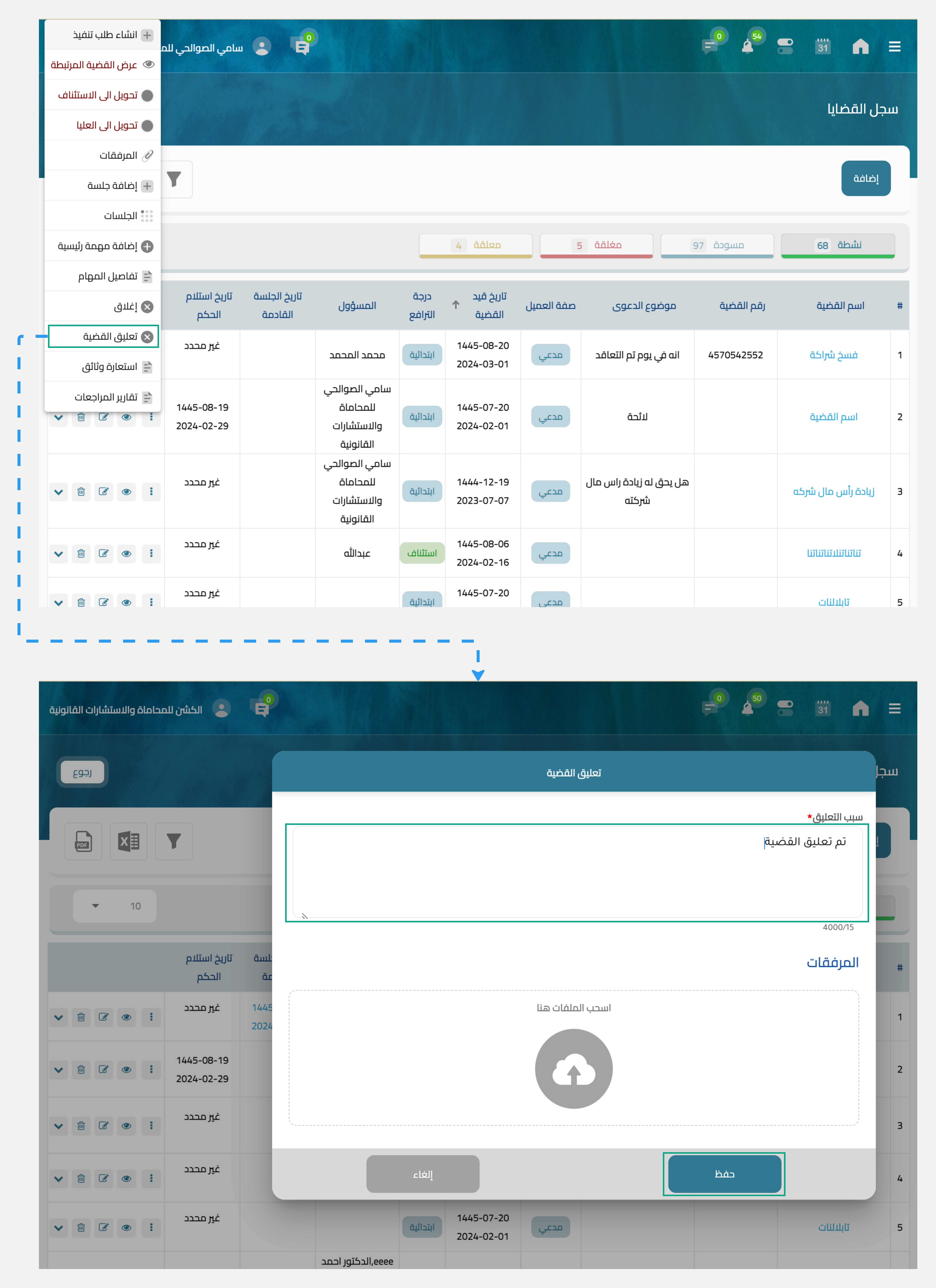 تعليق قضية إتخاذ إجراء للقضية إدارة القضايا تعليق قضية يمكنك تعليق قضية معينة لسبب ما عن طريق إختيار القضية الموجودة ضمن سجل القضايا من خلال أيقونة "" الثلاث نقاط ثم إختيار تعليق واضافة سبب التعليق كما يمكنك رفع مرفقات عن سبب تعليق القضية. هل كان المحتوى مفيد لكم؟ شكرًا لكم على التقييم! شكرًا لكم على التقييم! ساعدنا بتقديم إقتراحتكم من خلال صفحة التقييم صفحة التقييم من هنا.