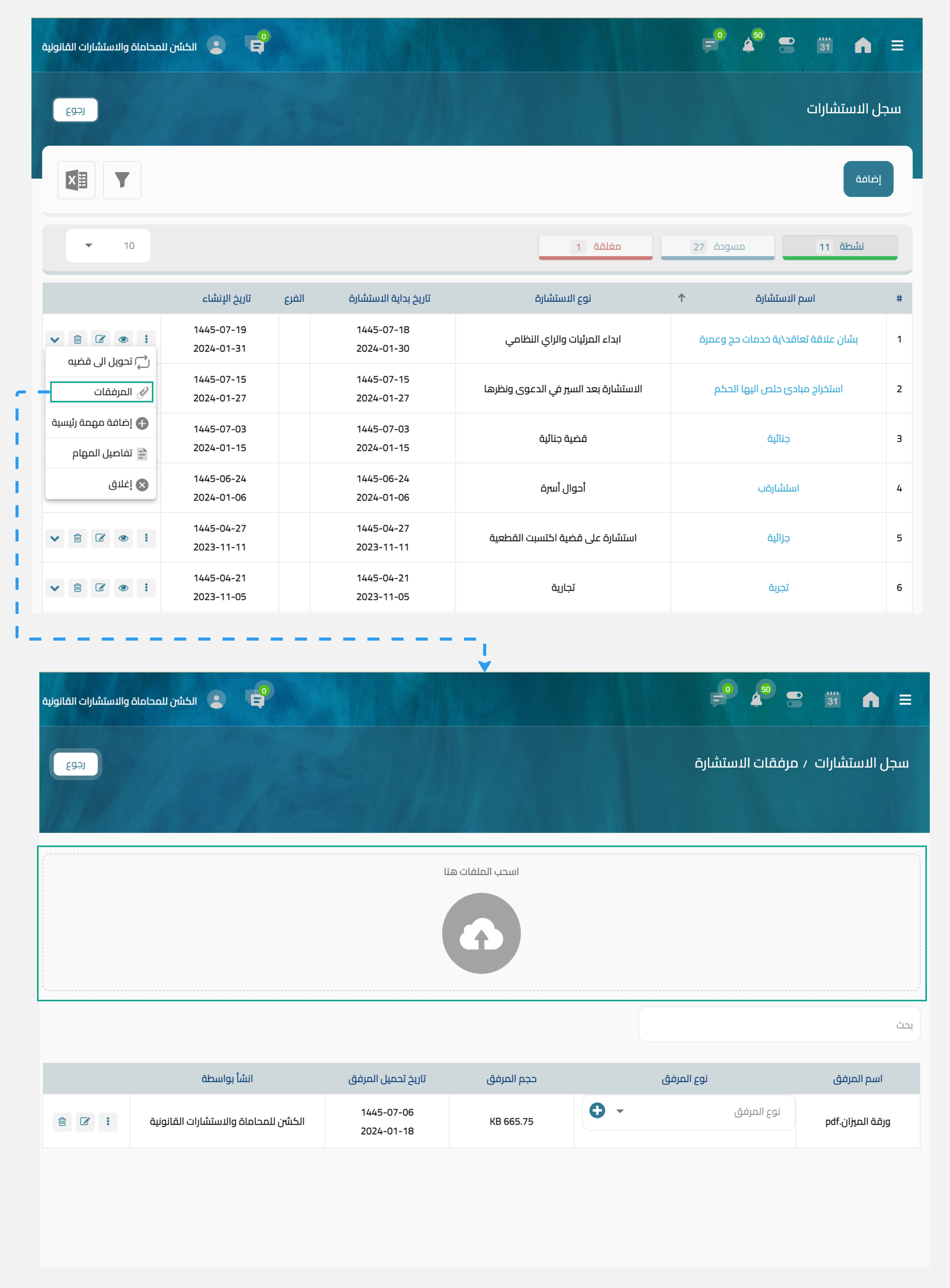 مرفقات الاستشارة اضافة مرفق للاستشارة المرفقات إدارة الإستشارات مرفقات الاستشارة يمكنك الإطلاع علي مرفقات الاستشارة عن طريق الضغط على أيقونة النقاط الثلاث ثم إختيار "المرفقات". ملاحظة كما يمكنك اضافة مرفق جديد خاص بالاستشارة المحددة عن طريق رفع مرفق جديد من خلال أيقونة المرفقات. هل كان المحتوى مفيد لكم؟ شكرًا لكم على التقييم! شكرًا لكم على التقييم! ساعدنا بتقديم إقتراحتكم من خلال صفحة التقييم صفحة التقييم من هنا.