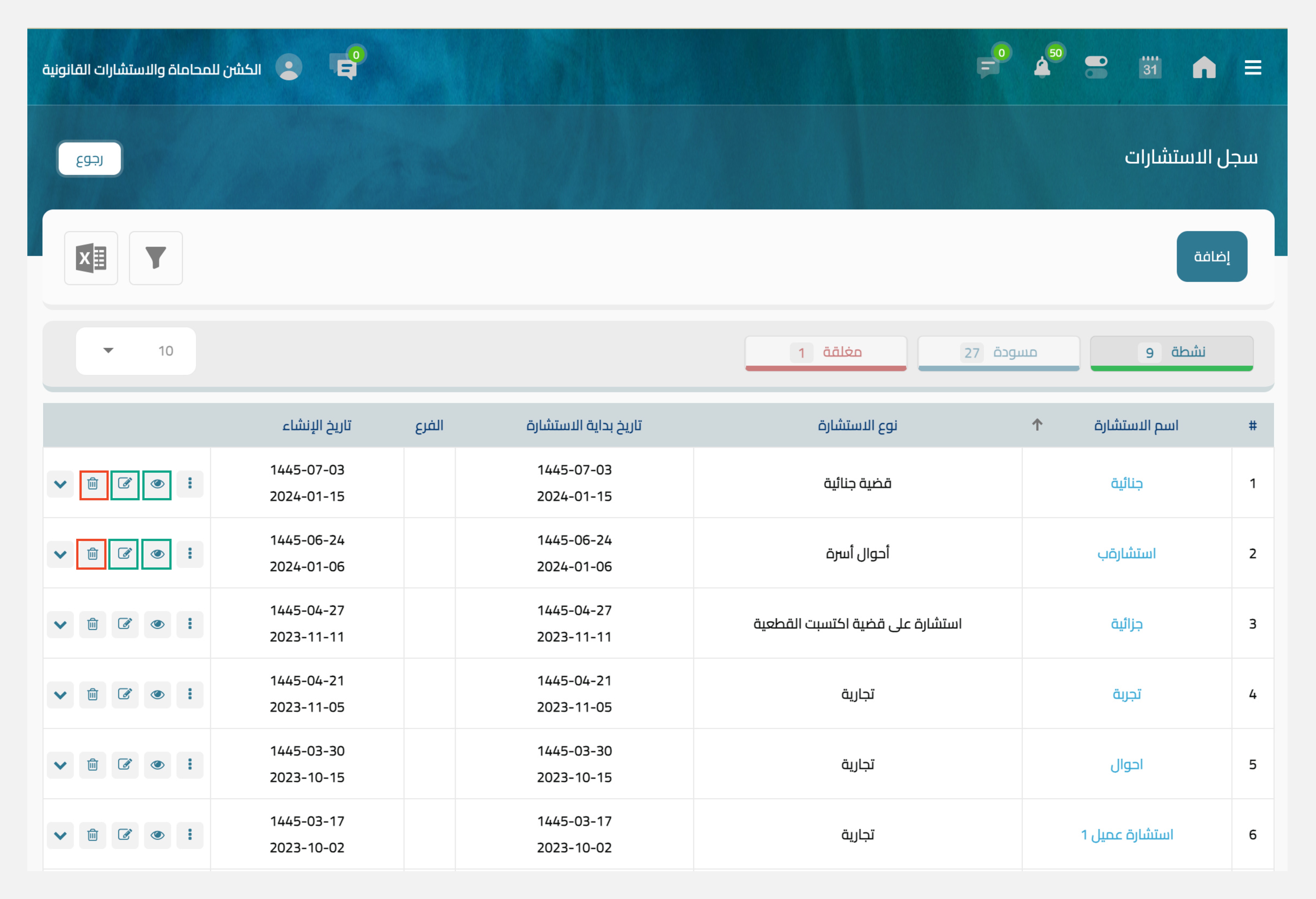 تعديل إستشارة الإطلاع على تفاصيل الاستشارة إدارة الإستشارات حذف إستشارة اجراءات الأساسية للإستشارة يوجد العديد من الاجراءات لكل إستشارة تشمل الإطلاع و التعديل و الحذف. هل كان المحتوى مفيد لكم؟ شكرًا لكم على التقييم! شكرًا لكم على التقييم! ساعدنا بتقديم إقتراحتكم من خلال صفحة التقييم صفحة التقييم من هنا.