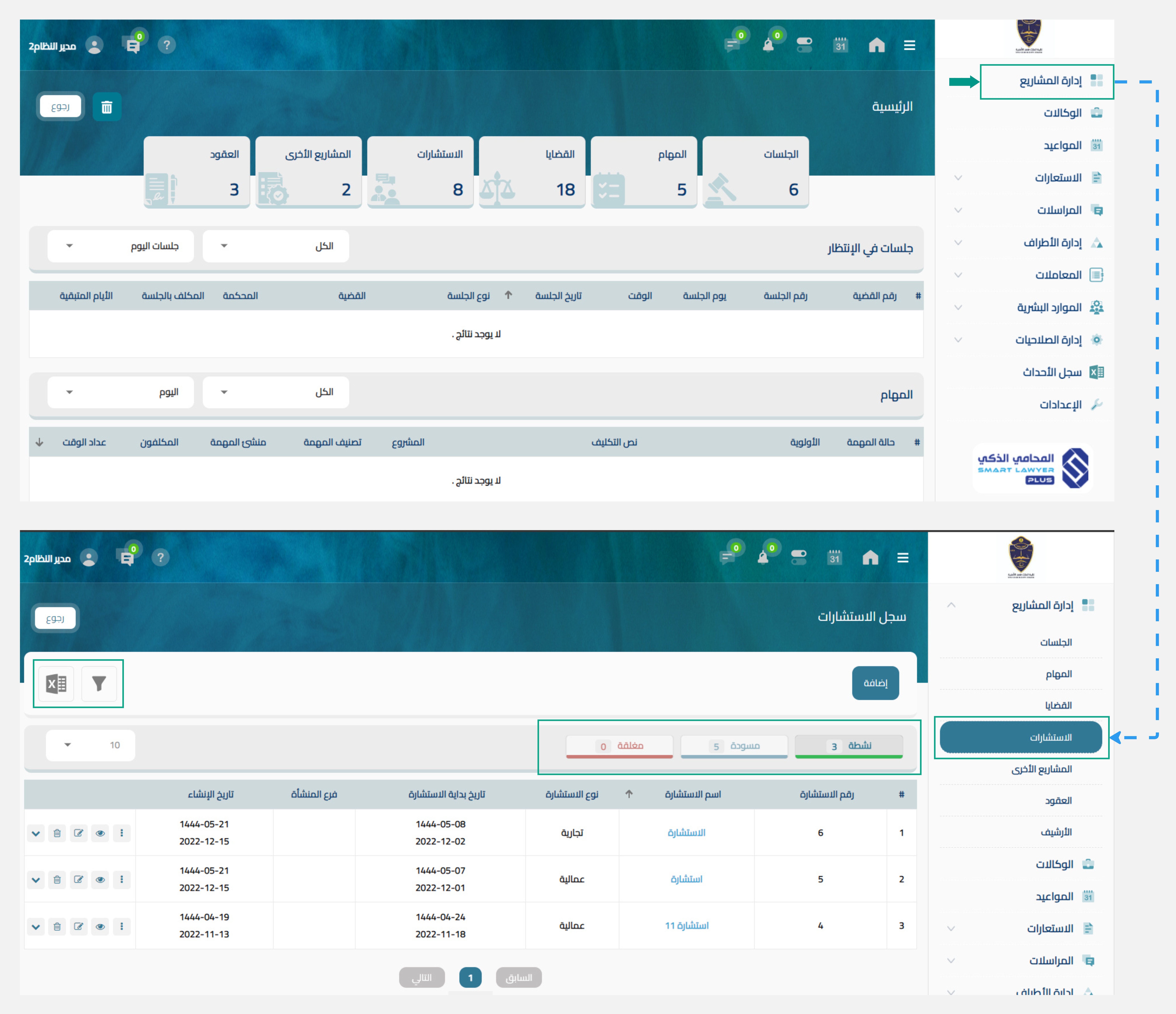 يمكنك فلترة الاستشارات حسب حالتها أو التاريخ. كما يمكنك تصدير جميع الاستشارات إلى ملف إكسيل.