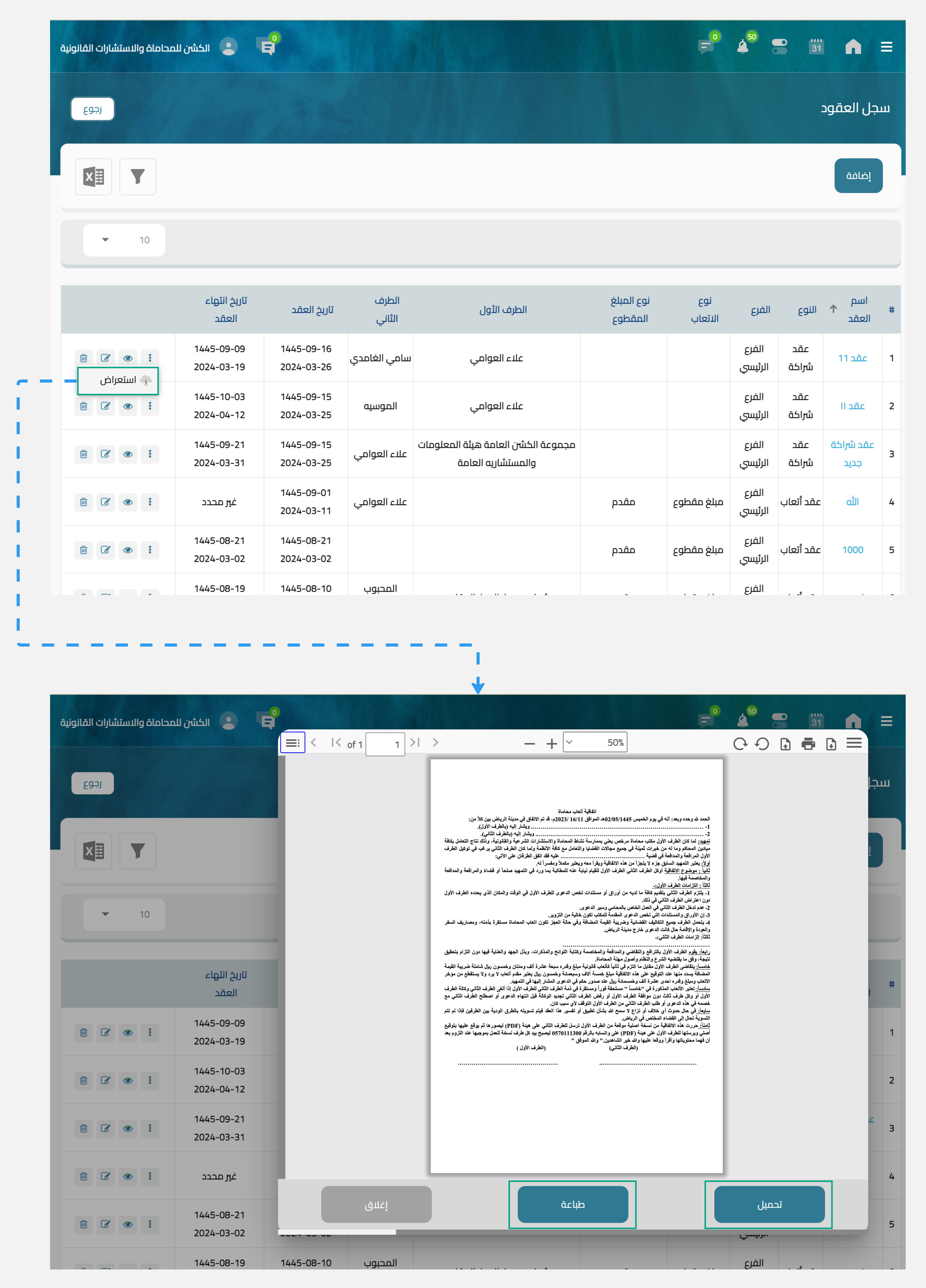 استعراض عقد الاطلاع على العقد بيانات العقد إدارة العقوود متابعة العقود استعراض عقد يمكنك استعراض عقد مكتمل عن طريق تحديد العقد من سجل العقود ثم الضغط على أيقونة الثلاث نقاط "" وإختيار استعراض بحيث تتمكن من طباعة أو تحميل العقد ليتم التوقيع عليه. هل كان المحتوى مفيد لكم؟ شكرًا لكم على التقييم! شكرًا لكم على التقييم! ساعدنا بتقديم إقتراحتكم من خلال صفحة التقييم صفحة التقييم من هنا.