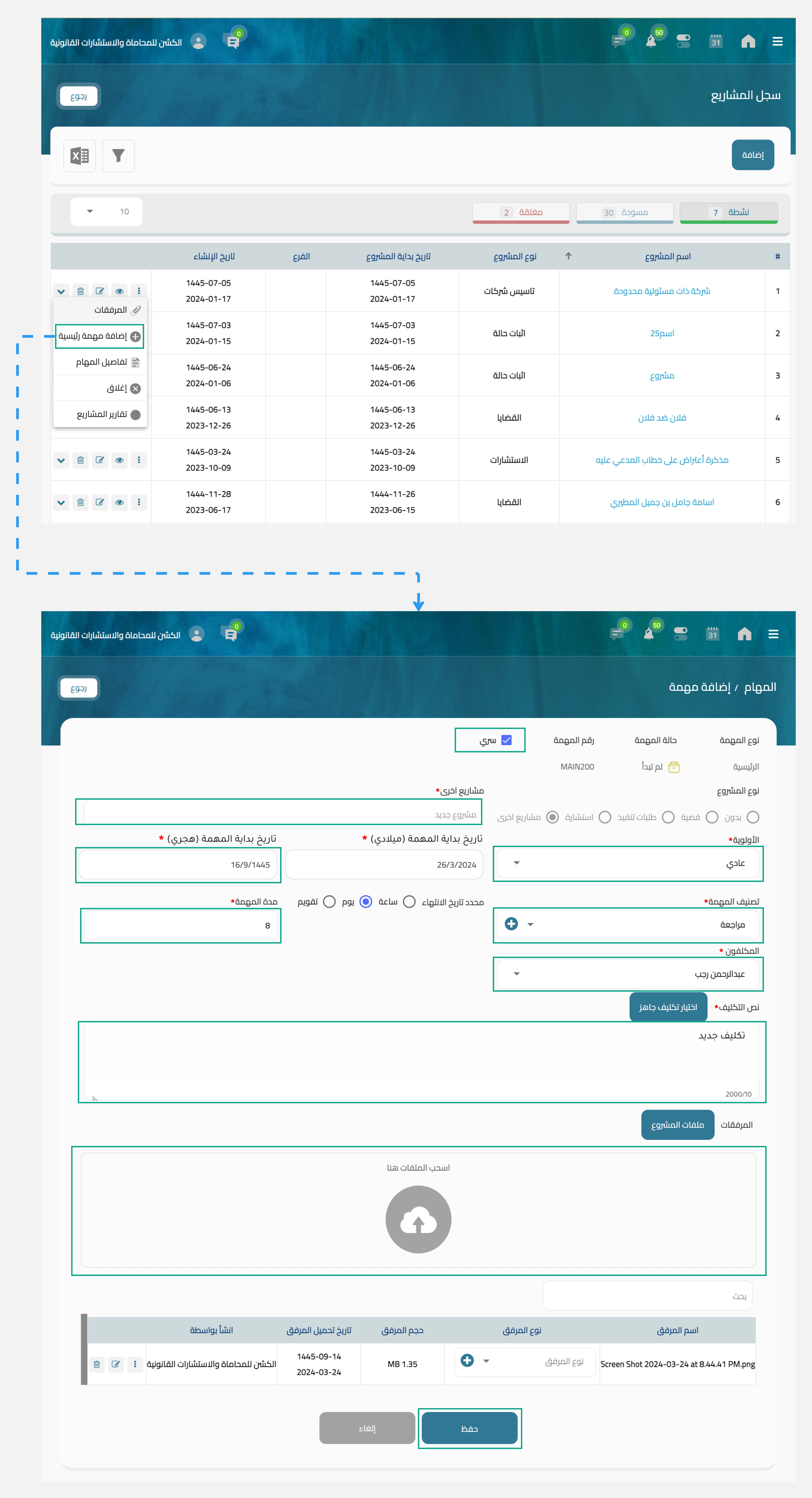 - المرفقات: يمكنك رفع مرفقات متعلقة بالمهمة أو إختيار مرفقات من الأرشيف وإضافتها في هذه المهمة.