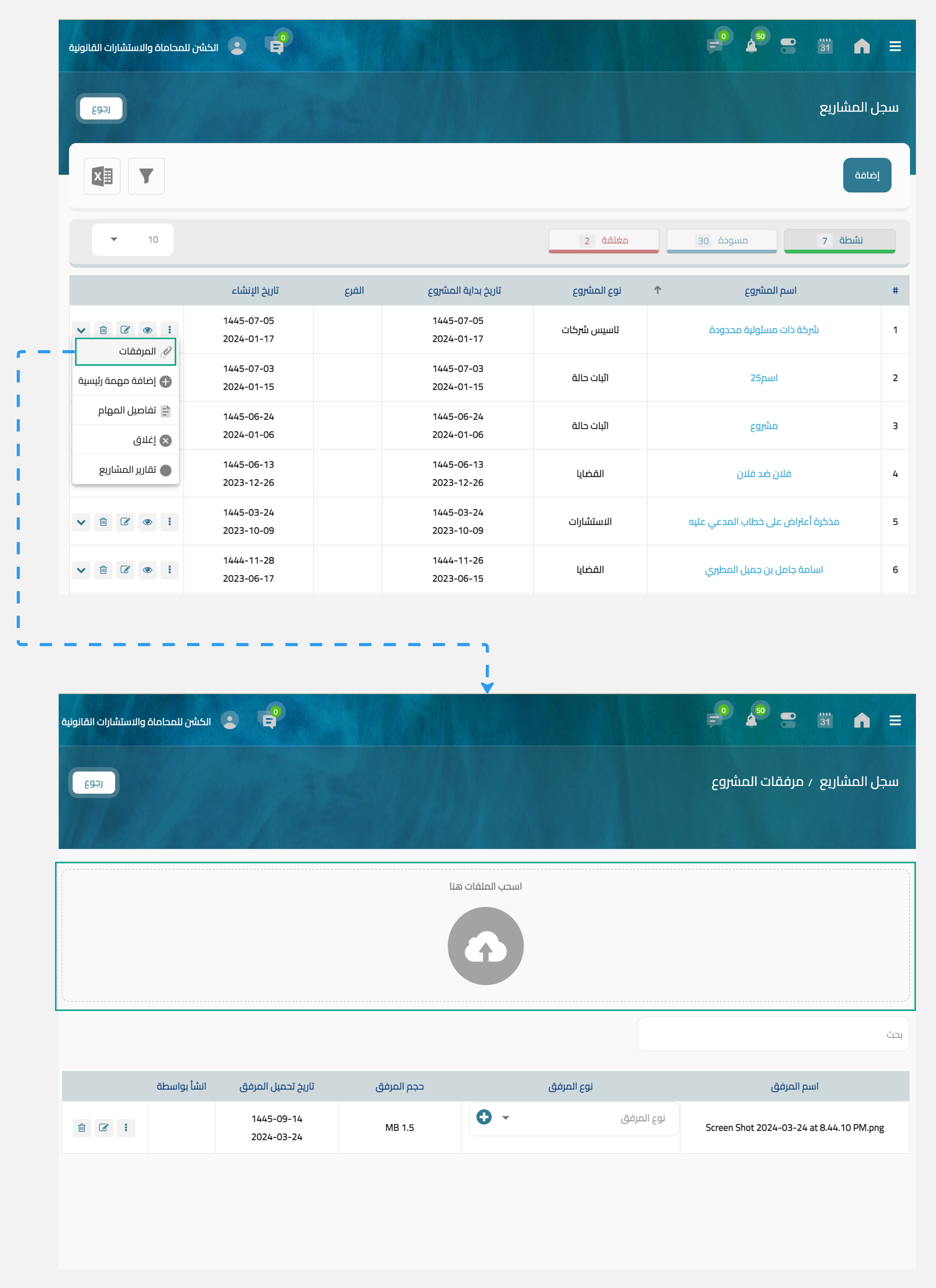 مرفقات المشروع اضافة مرفق للمشروع المرفقات إدارة المشاريع مرفقات المشروع يمكنك الإطلاع علي مرفقات المشروع عن طريق الضغط على أيقونة "" النقاط الثلاث ثم إختيار "المرفقات". ملاحظة كما يمكنك اضافة مرفق جديد خاص بالمشروع المحدد عن طريق رفع مرفق جديد من خلال أيقونة المرفقات. هل كان المحتوى مفيد لكم؟ شكرًا لكم على التقييم! شكرًا لكم على التقييم! ساعدنا بتقديم إقتراحتكم من خلال صفحة التقييم صفحة التقييم من هنا.