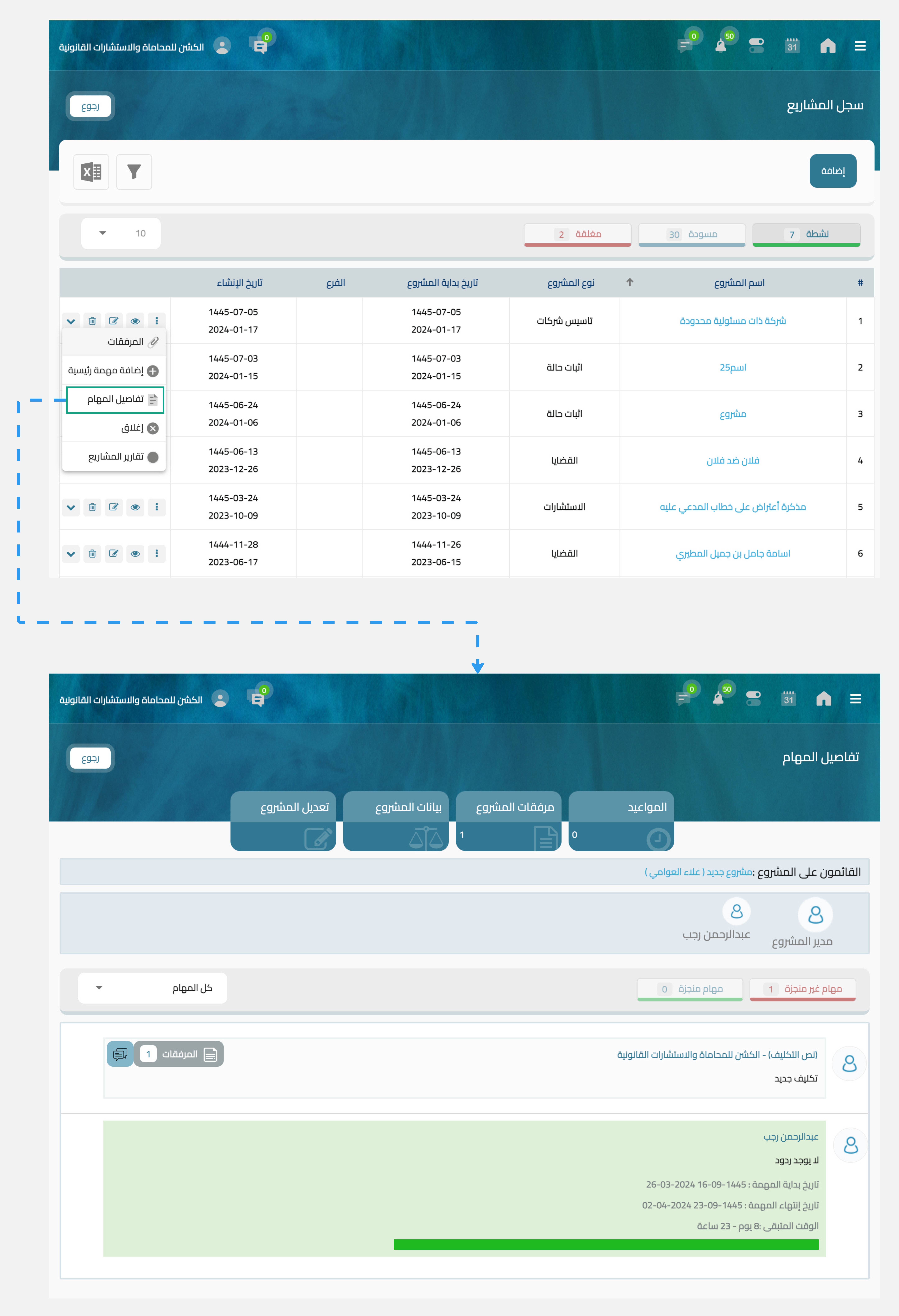 " الموجودة في المشروع المحدد للإطلاع على المزيد من الإجراءات. - سوف تظهر لك خيارات متعددة، يمكنك الضغط على "مهام المشروع أو تفاضيل المهام" بحيث تظهر لك جميع المهام المتعلقة بهذا المشروع.