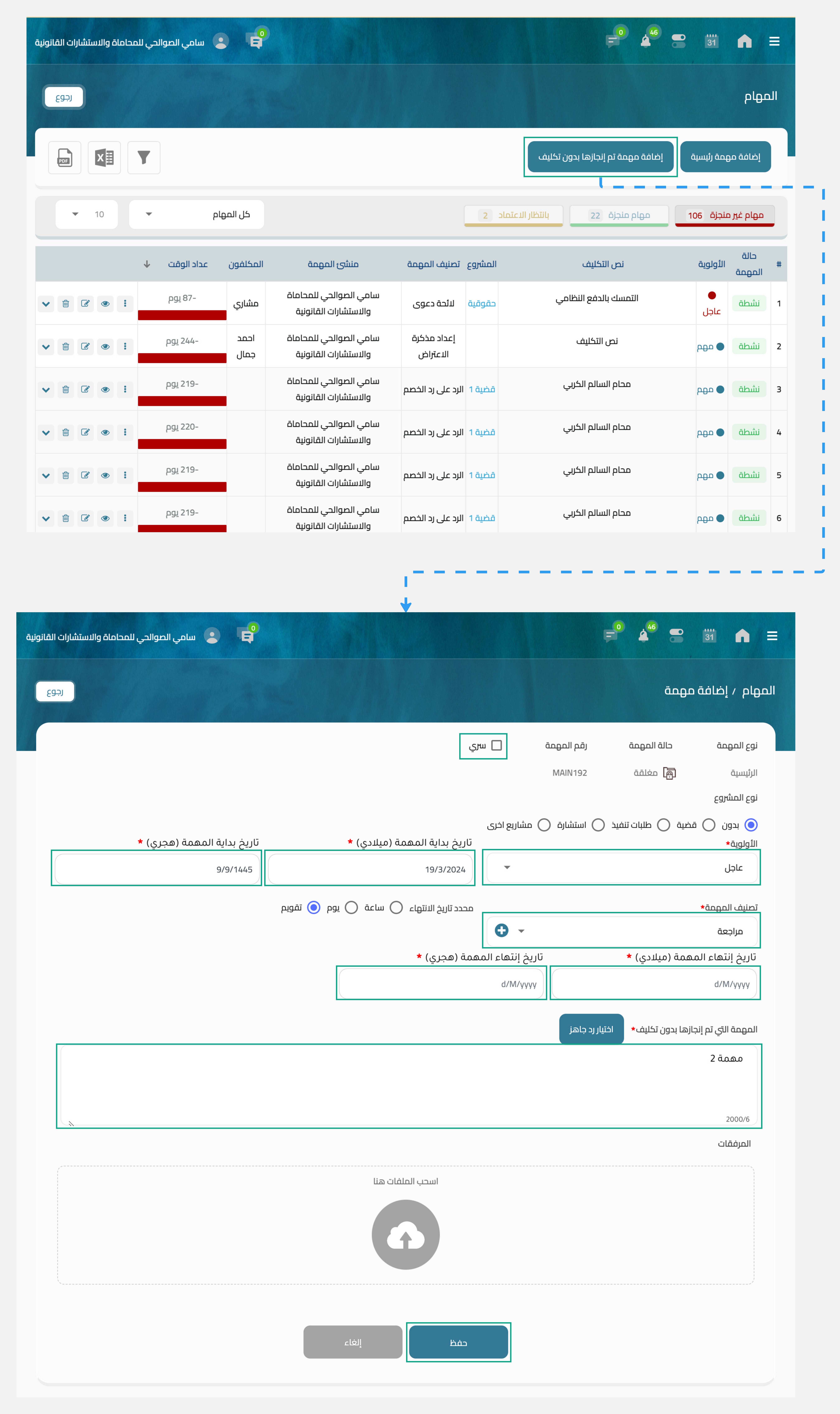 - المرفقات: يمكنك رفع مرفقات متعلقة بالمهمة أو إختيار مرفقات من الأرشيف وإضافتها في هذه المهمة.