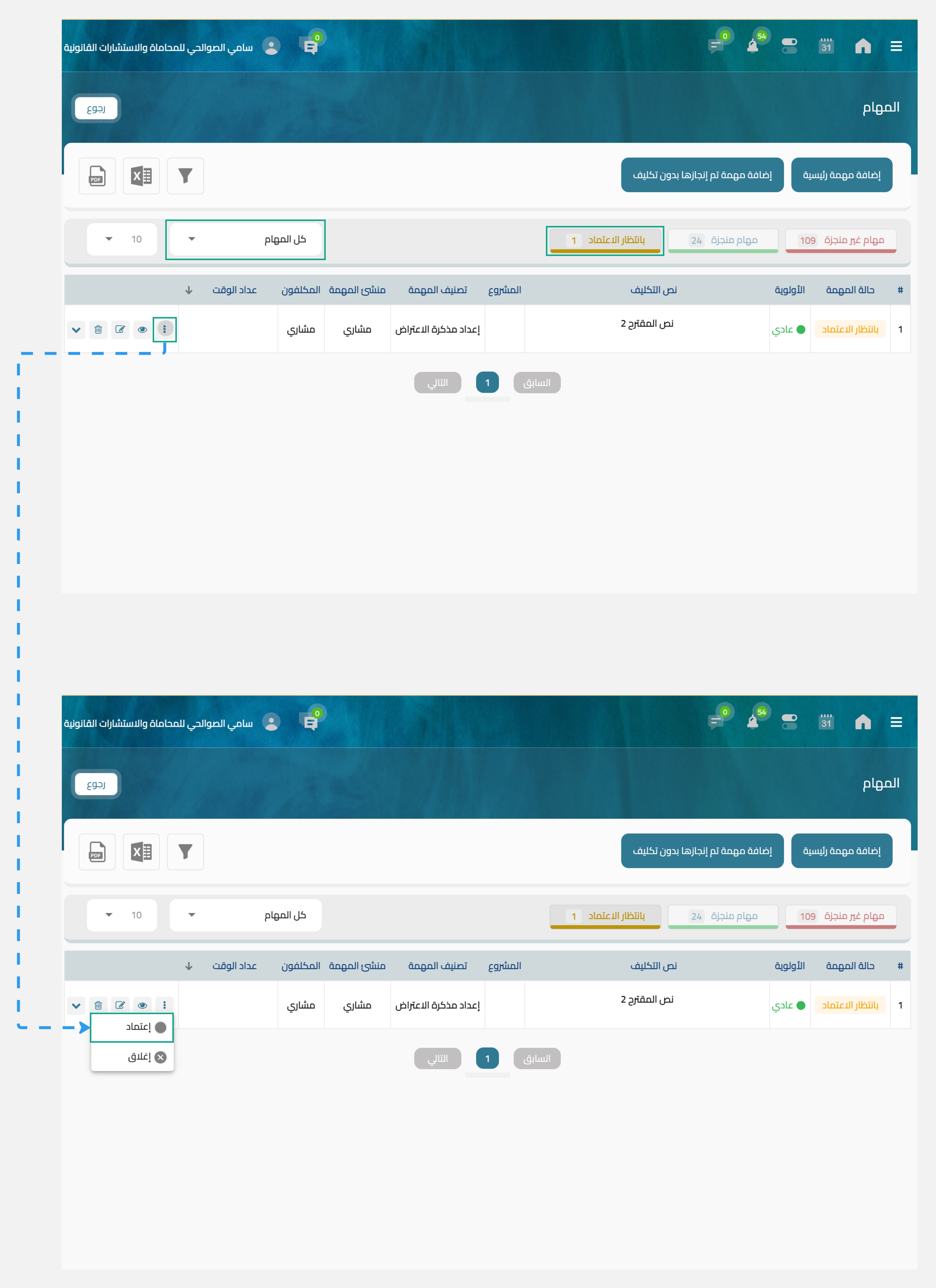 يمكنك اعتماد مهمة إذا كنت المدير أو الموظف الذي قمت بإضافتها بعد إرسال طلب اعتماد من قبل المكلف/المكلفين بها عن طريق إختيار حالة المهمة من نوع "بإنتظار الاعتماد" ثم الضغط علي أيقونة النقاط الثلاث "