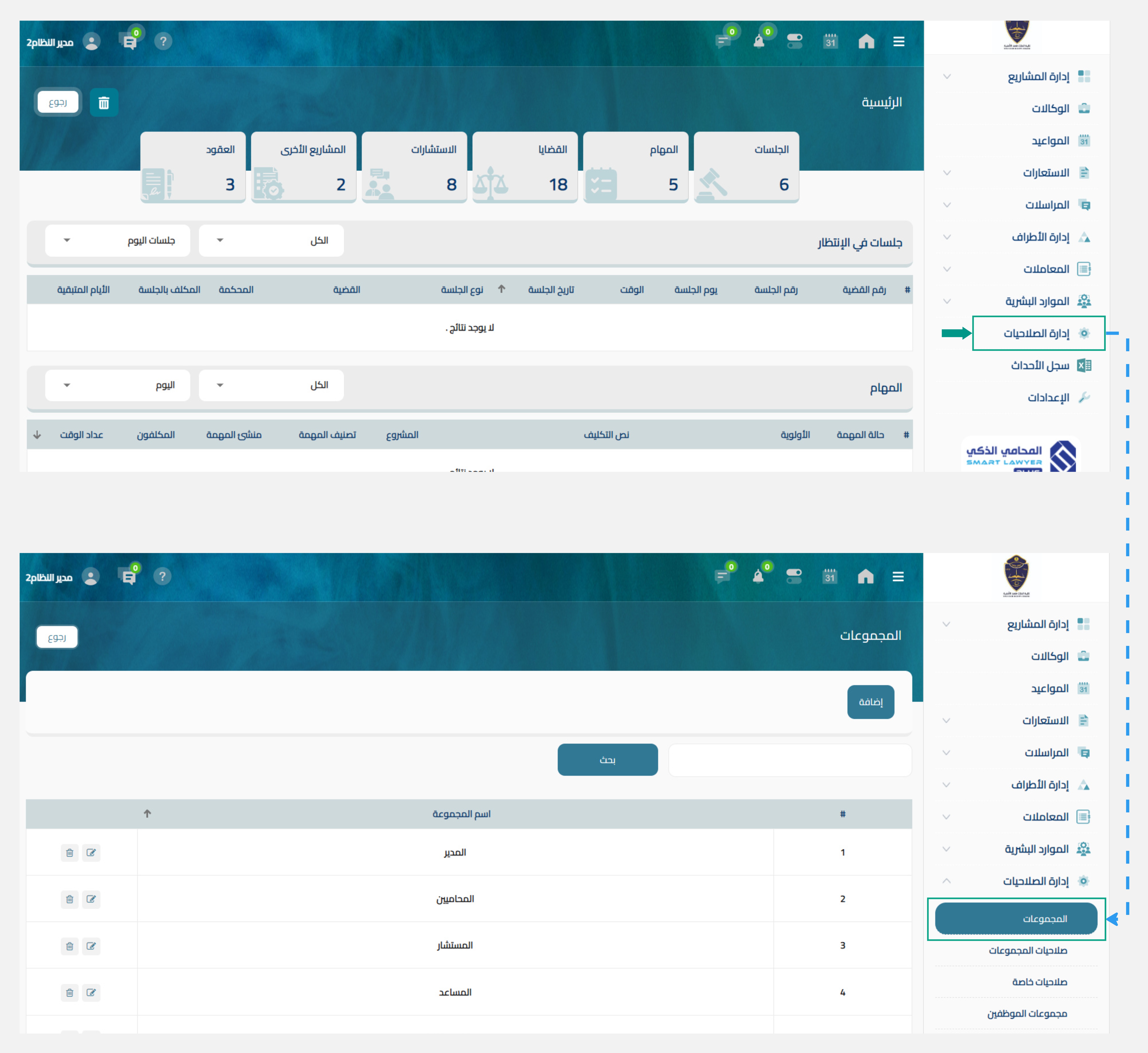 يُمكنك الاطلاع على جميع المجموعات الموجودين في المؤسسة عن طريق إختيار "الموارد البشرية" من خلال القائمة الجانبية ثم الضغط على "المجموعات" بحيث تتمكن من الاطلاع على سجل المجموعات وبياناتهم وكذلك إدارتهم.