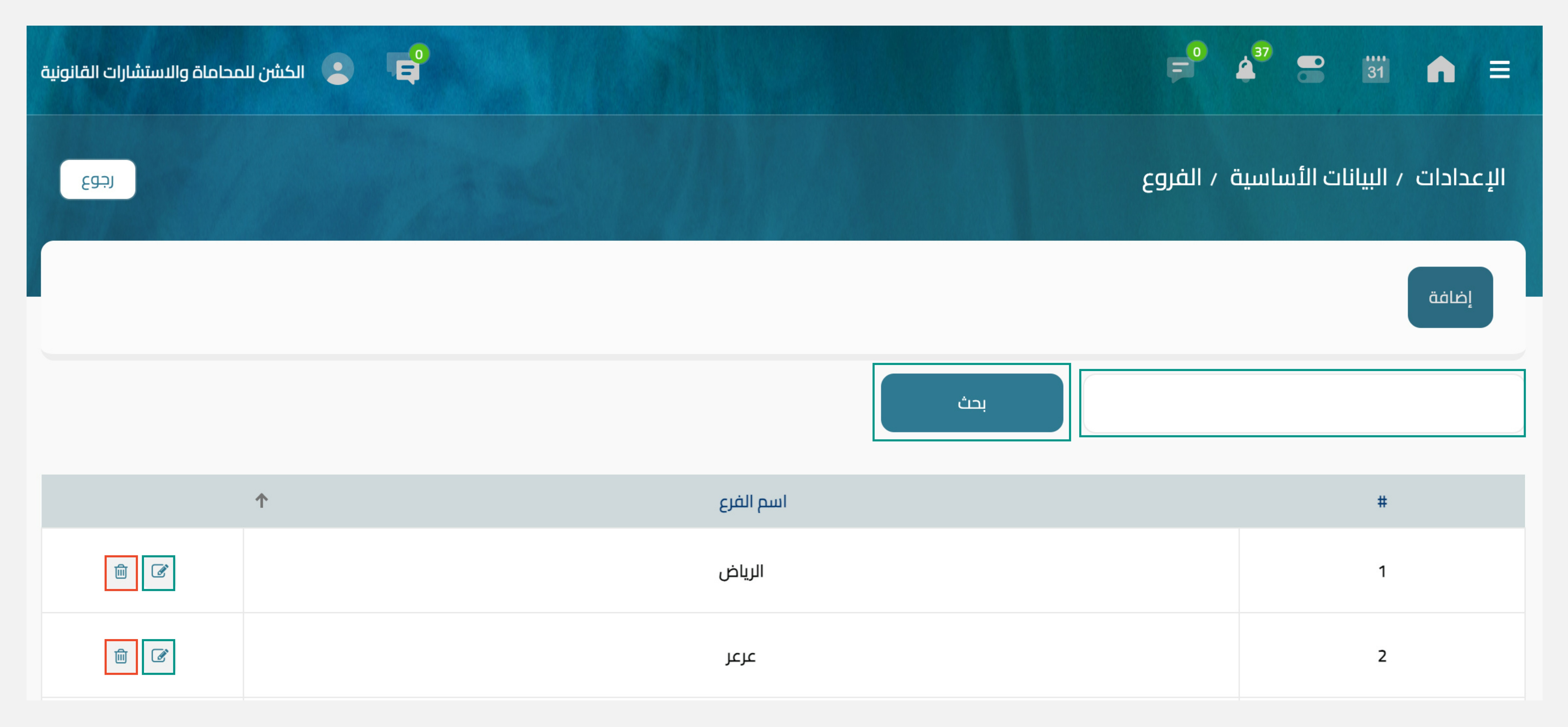 - التعديل: لتحديث بيانات الفرع المحدد.