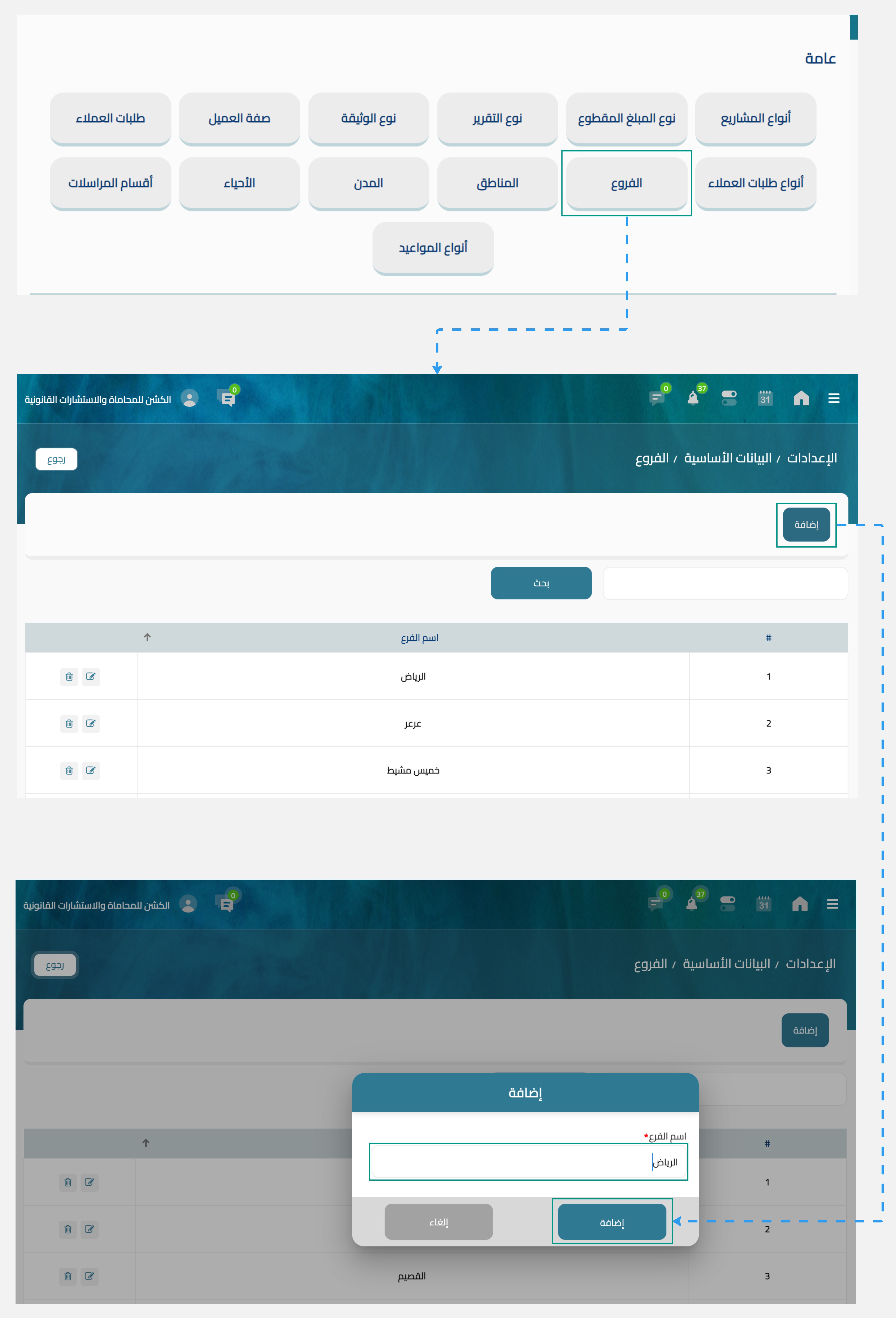 يمكنك اضافة الفروع بطريقة أخرى عند إستخدام النظام عند اضافة قضية جديدة.