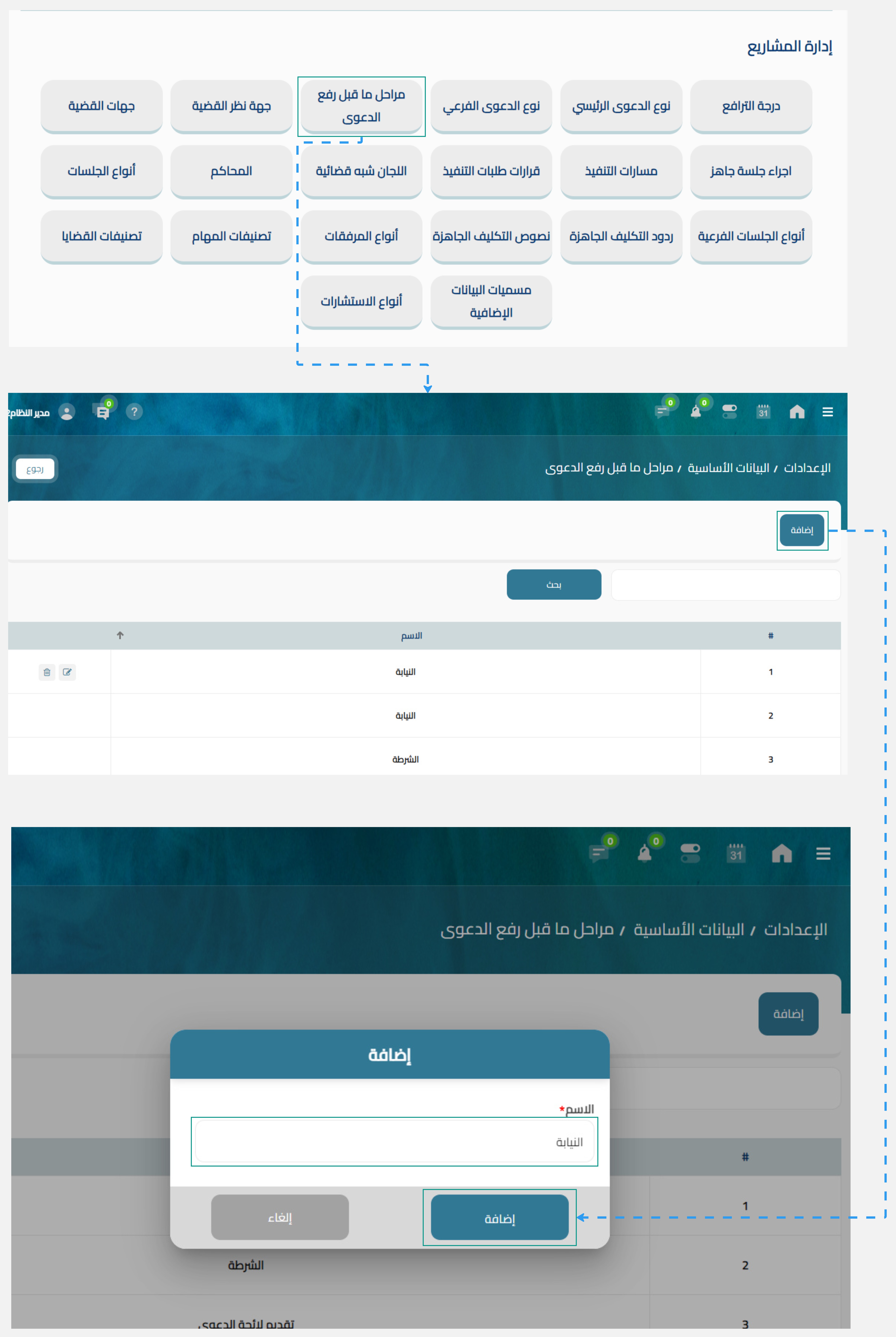 - أضغط على زر اضافة لتقوم باضافة مرحلة ما قبل رفع الدعوى جديدة داخل النظام.
