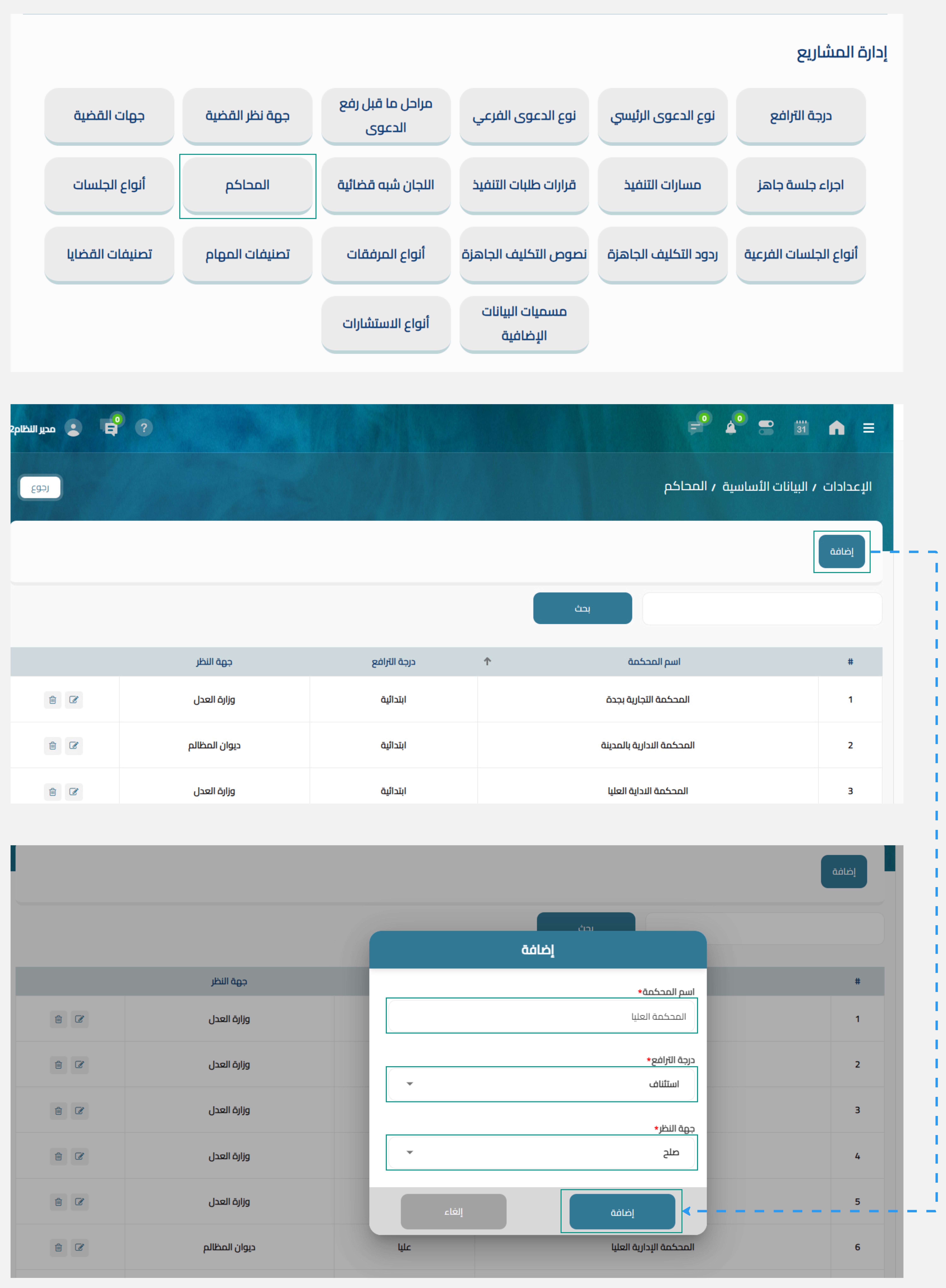 - أضغط على زر اضافة لتقوم باضافة محكمة جديدة داخل النظام.