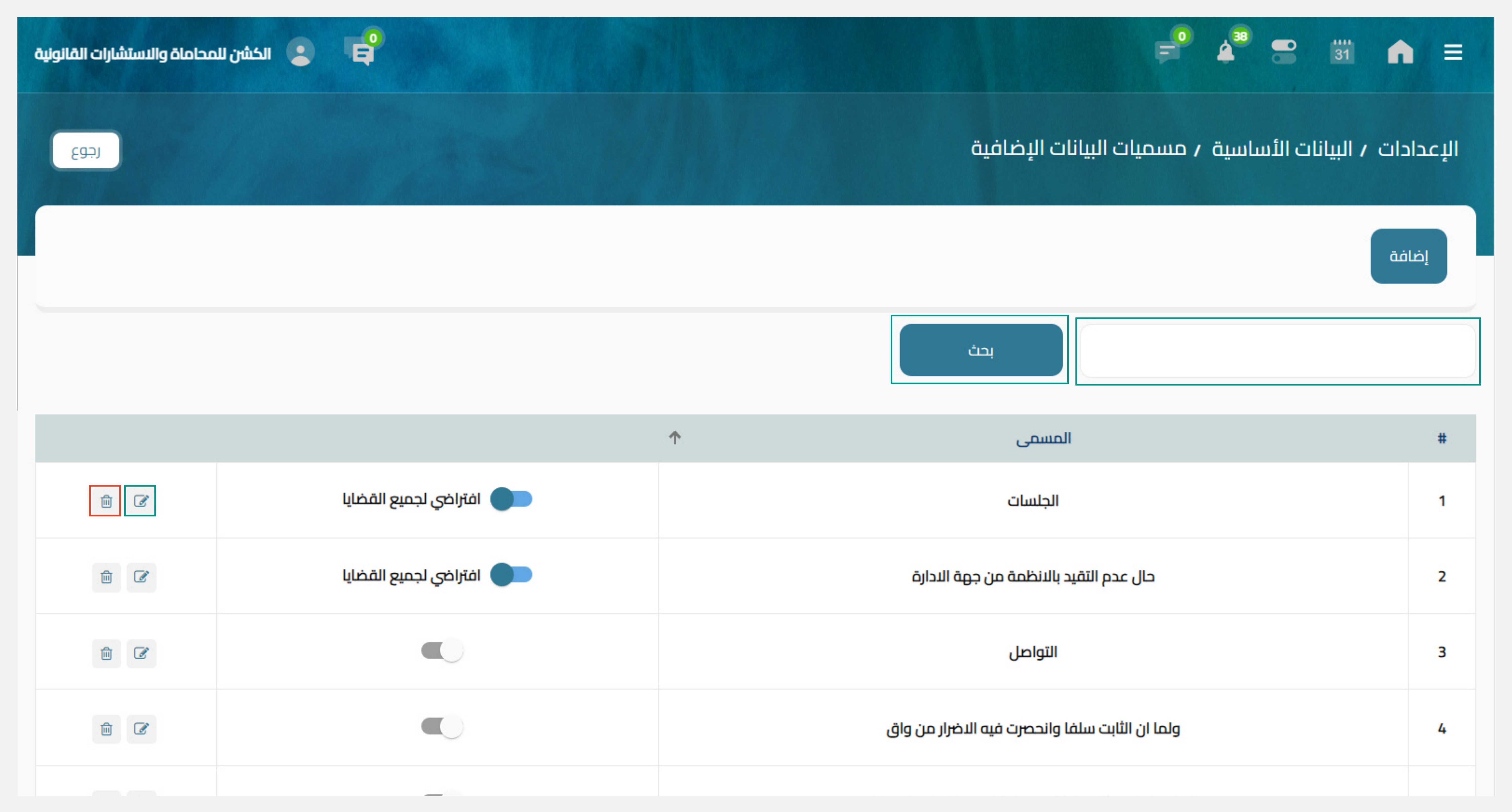 - البحث: بحيث يُمكنك البحث عن مسمى بيانات إضافية معين عن طريق البحث بالأسم ثم الضغط على زرالبحث ليتم عرض النتائج.