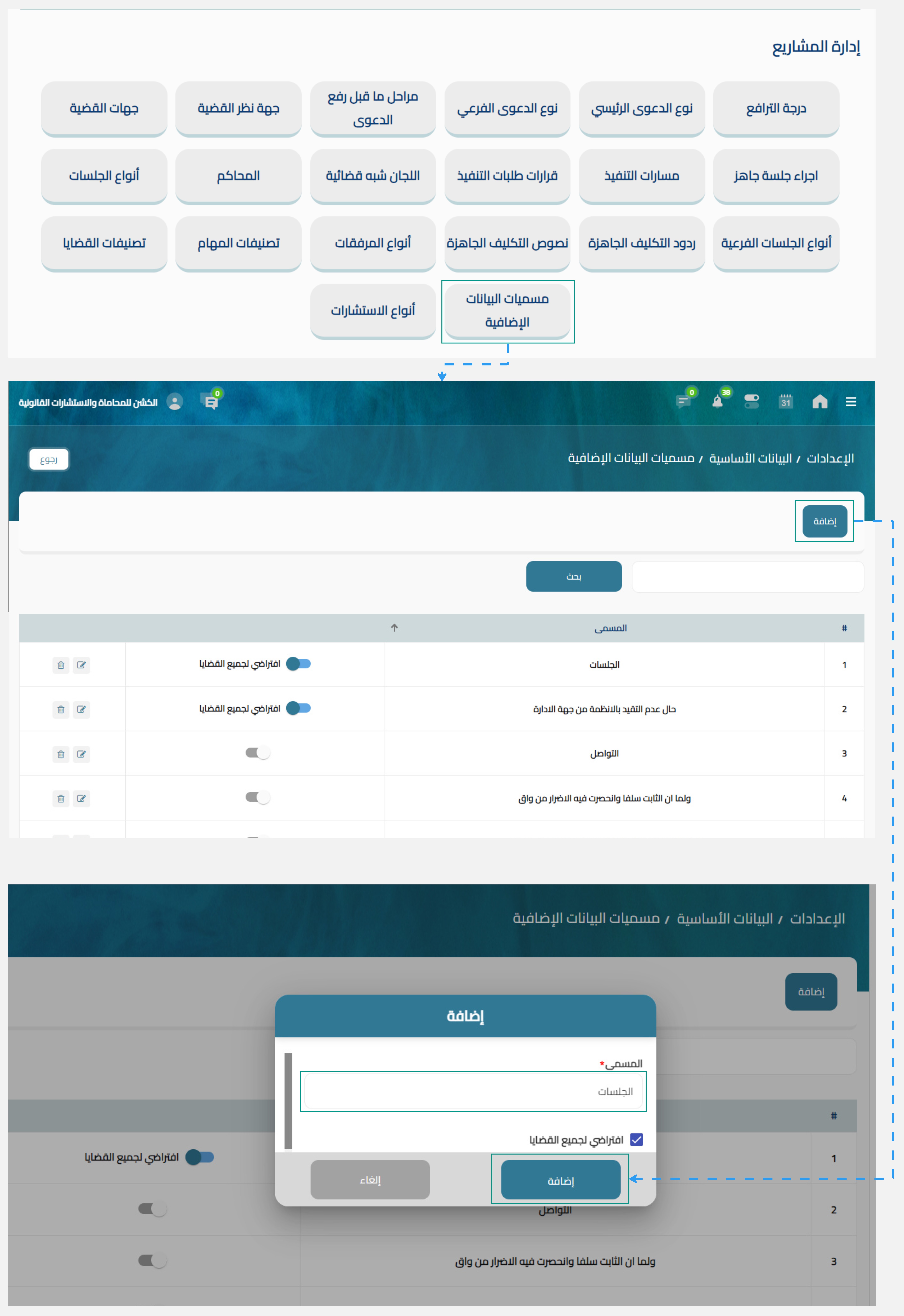 يمكنك اضافة مسميات البيانات الإضافية بطريقة أخرى عند طريق اضافة بيانات القضية عند اضافة قضية.