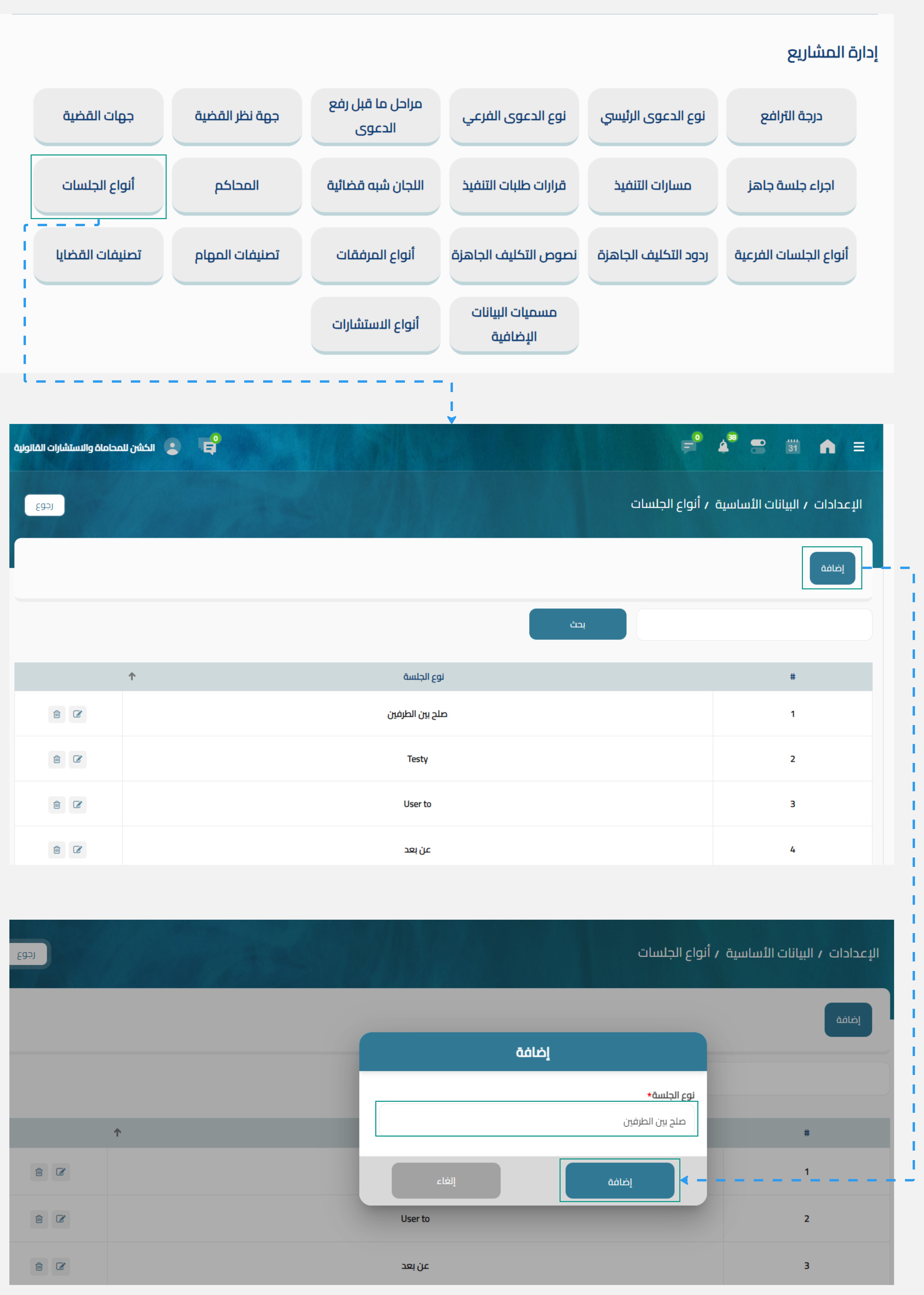 يمكنك اضافة انواع الجلسات بطريقة أخرى عند اضافة جلسة جديدة داخل النظام من النموذج الخاص بالجلسات اضافة جلسة.