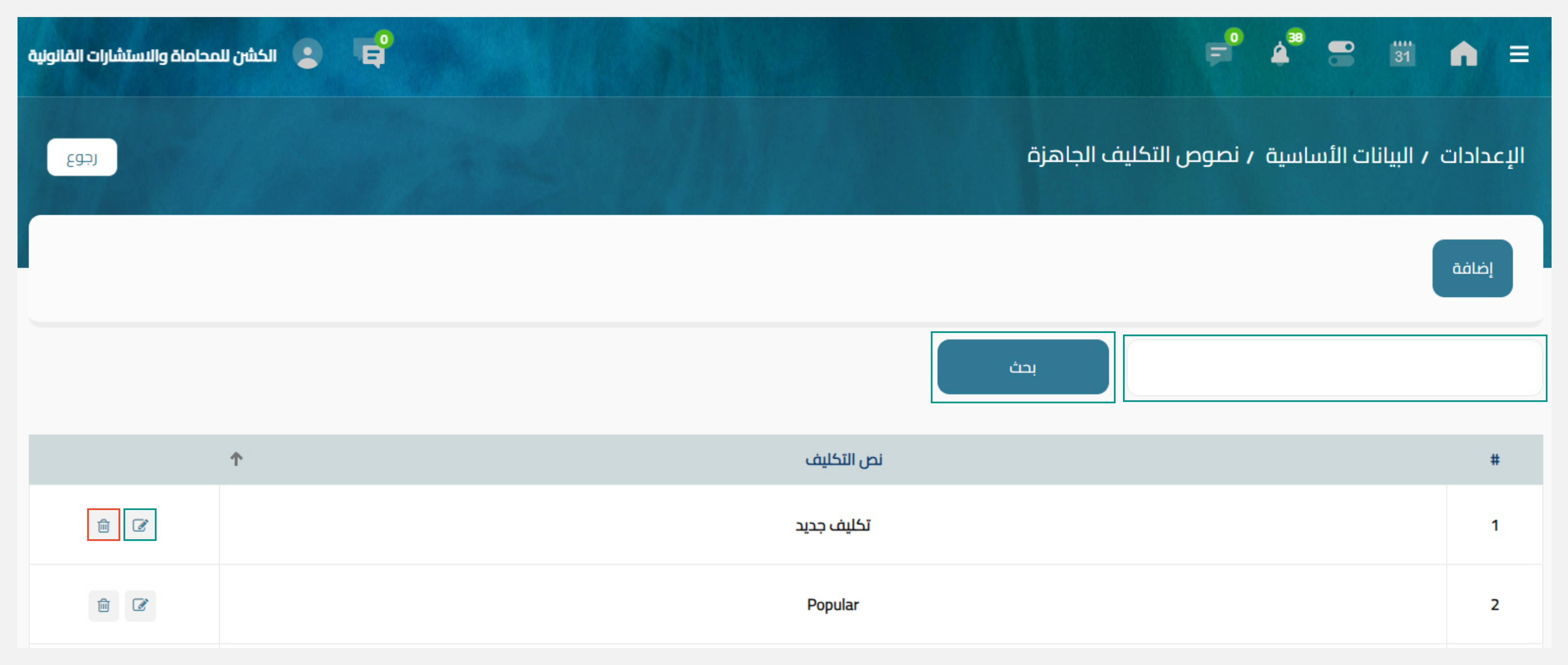 - البحث: بحيث يُمكنك البحث عن نص التكليف الجاهزة معين عن طريق البحث بالأسم ثم الضغط على زرالبحث ليتم عرض النتائج.