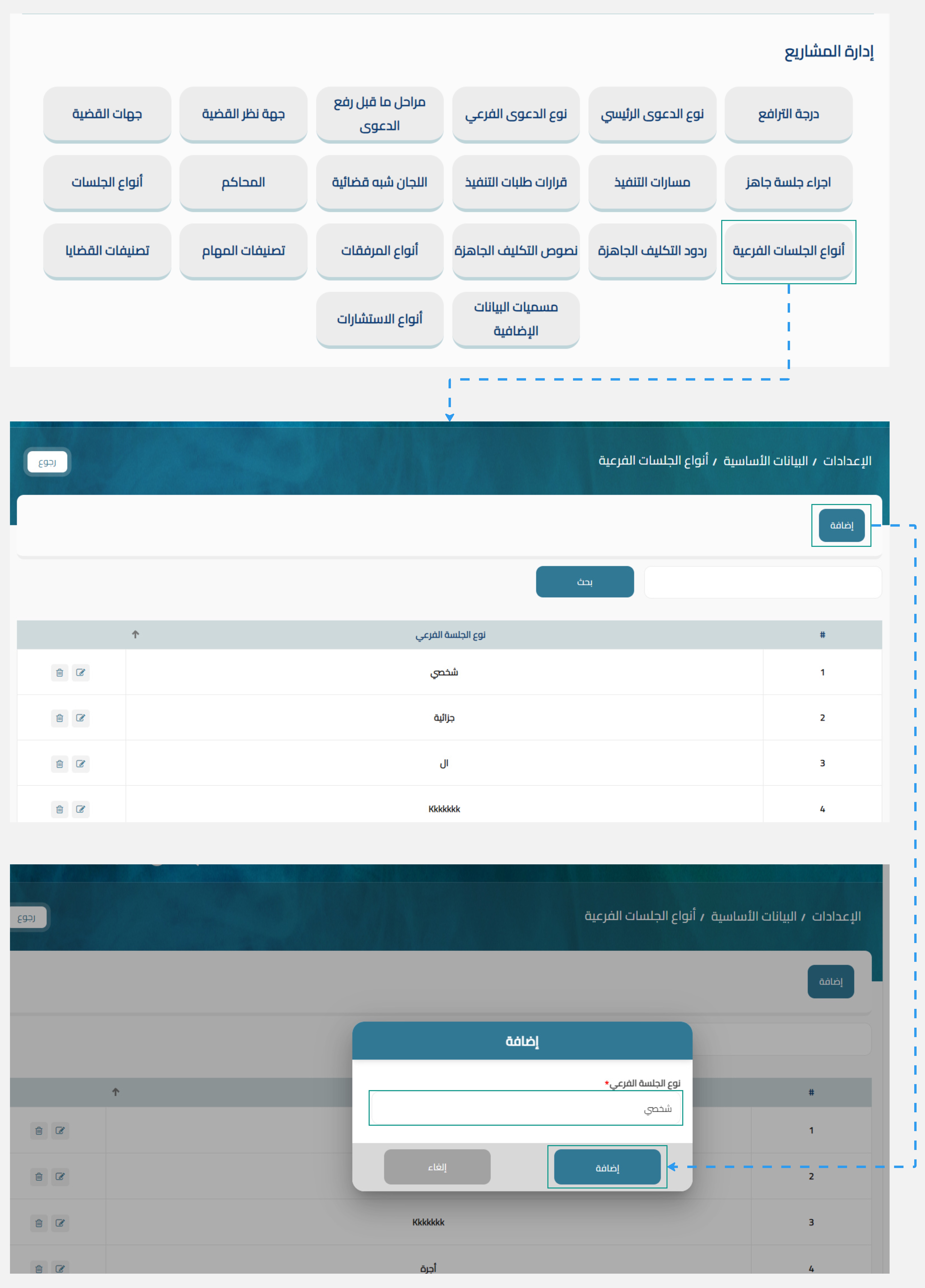 يمكنك اضافة انواع الجلسات الفرعية بطريقة أخرى عند اضافة جلسة جديدة داخل النظام من النموذج الخاص بالجلسات اضافة جلسة.