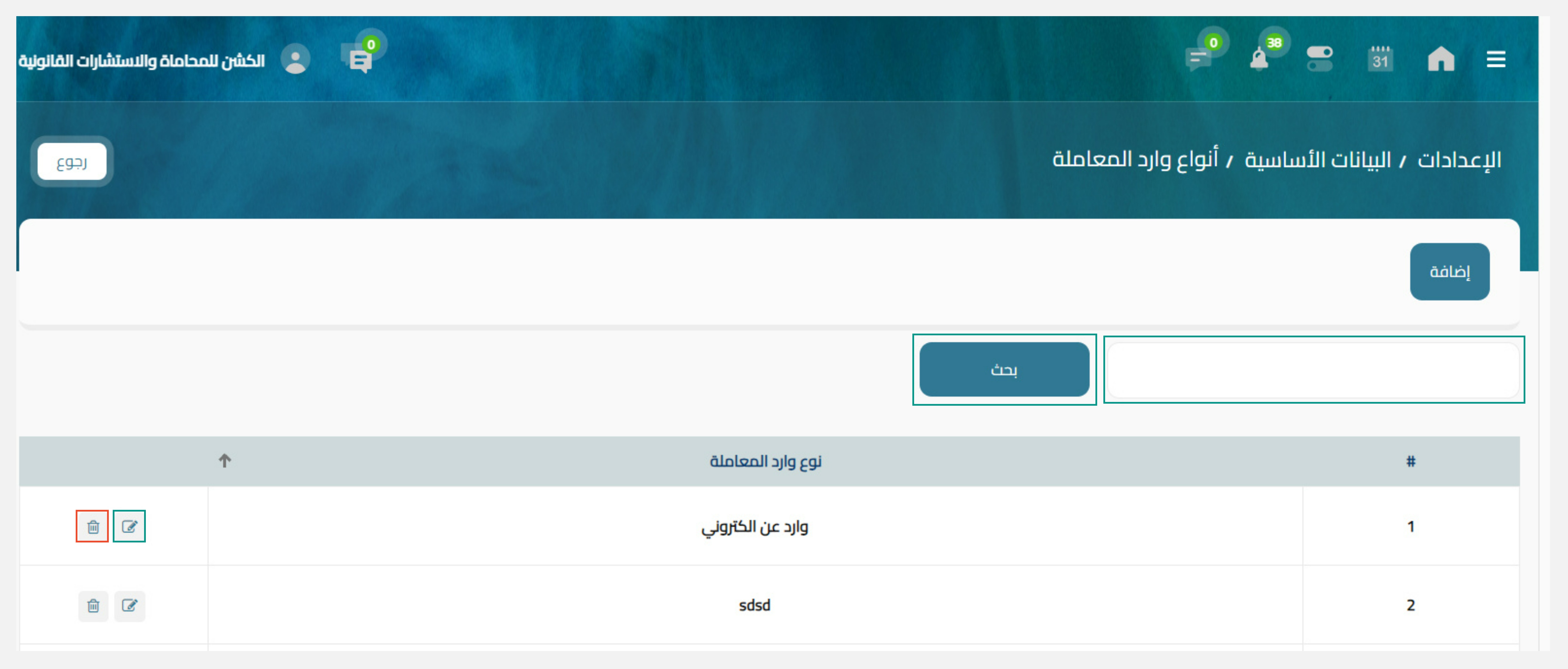- البحث: بحيث يُمكنك البحث عن نوع وارد معاملة معين عن طريق البحث بالأسم ثم الضغط على زرالبحث ليتم عرض النتائج.