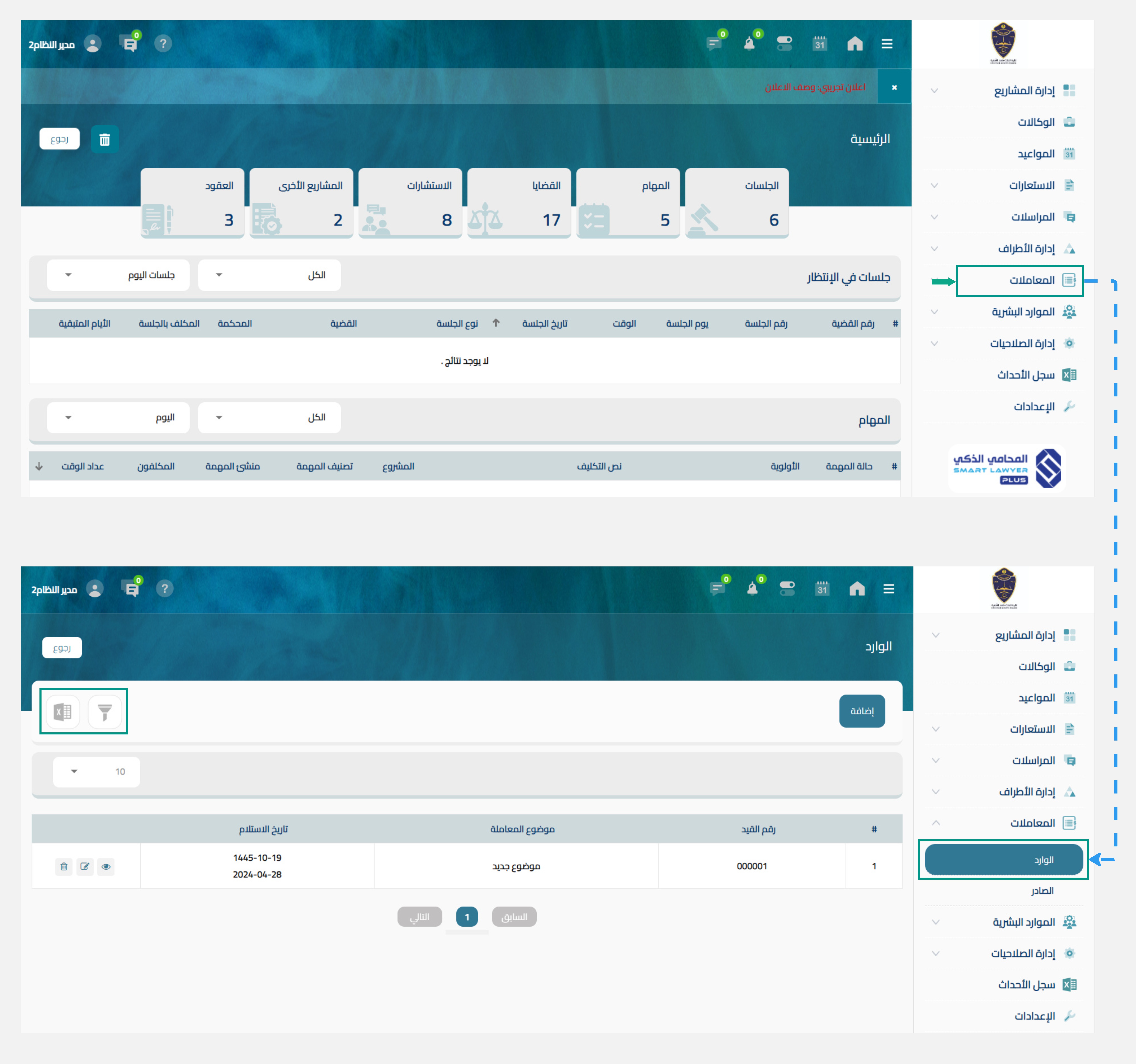 يمكنك الاطلاع على قائمة المعاملات الواردة من خلال قسم المعاملات الموجود في القائمة الجانبية ثم رختيار الواردة بحيث تتمكن من الاطلاع على جميع المعاملات الواردة لك.