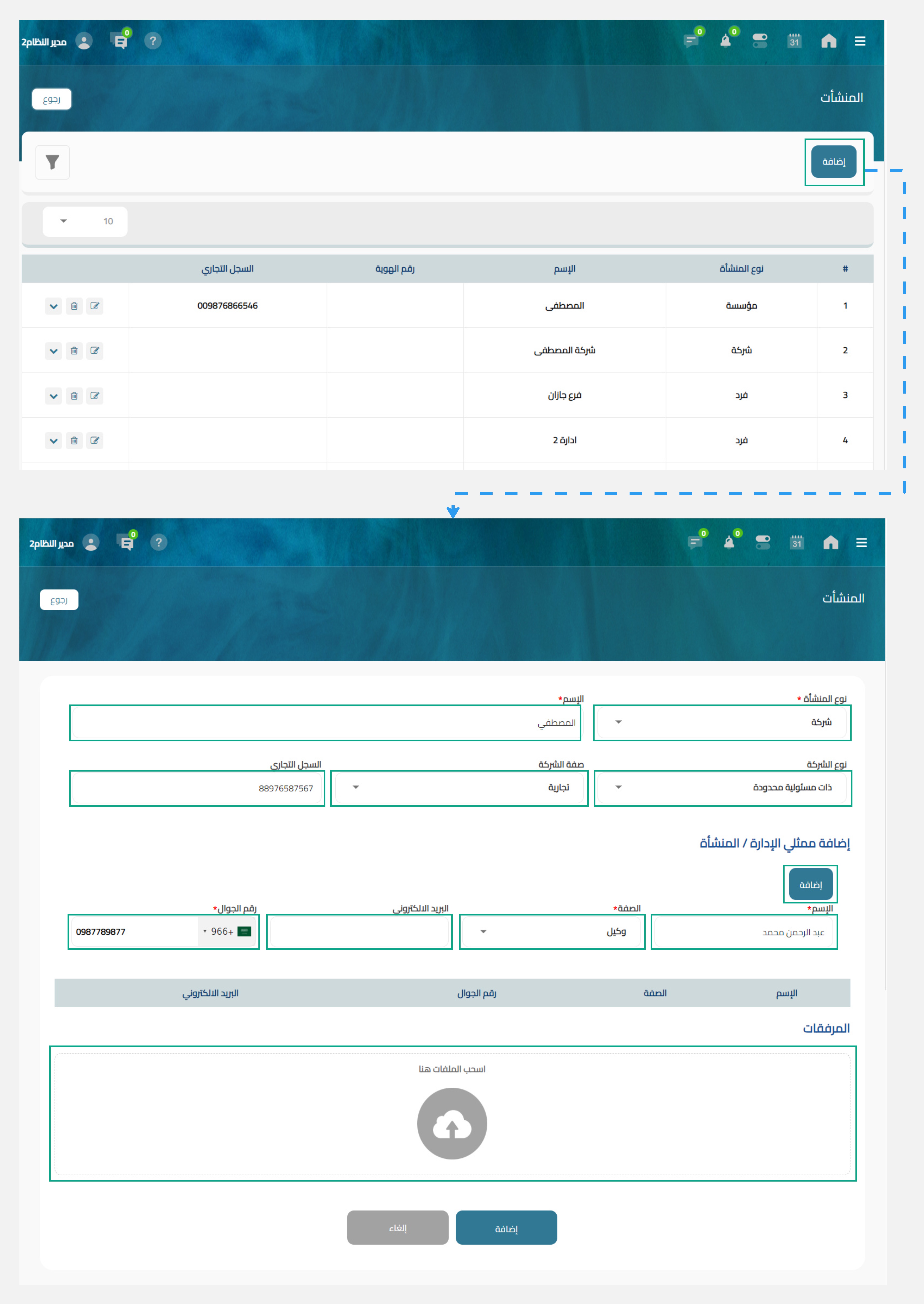 يمكنك اضافة بيانات ممثلي المنشأة التالية عند اضافة منشأة جديد.